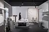 Toalettet var også plassert midt i rommet, vasken var usannsynlig lav, og det hang en BH laget av ståltråd fra taket. Vasken hang lavt, spisebordet er trekantet og høyt med lave stoler, og et halskjede i keramikk var som laget for en kjempe fra eventyrets verden. Pichard beskriver dette som en lek med skalering og dimensjoner.