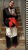 Ross styler en svart blazer og dressbukser med kanskje høstens største trend: blonder! Blondekjoler og -skjørt dominerer moteverdenen akkurat nå, og fungerer som den perfekte detaljen for å løfte antrekket ditt fra basic til wow. En feminin kontrast til de mer strukturerte plaggene – eller hva?