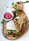 Wrapen er god både med og uten hummus, men jeg er svak for rosa rødbetehummus.