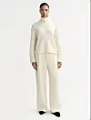 Rosie i en beige cashmeregenser med høy hals -et plagg som kan styles til alt og som føles tidløst sesong etter sesong.