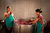 Slik farges kasjmirskjerfene for hånd: 10-15 skjerf legges i en gryte og farges ved bruk av håndkraft.