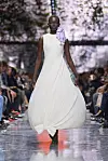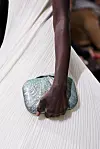Visningen åpnet med en trio av lange, plisserte virvler av stoff i svart, hvitt og oransje – former som tok inspirasjon fra keramikeren Magdalene Odundos kurvede leirkar. Anderson har lenge samarbeidet med den kenyanske kunstneren, også under sin tid hos Loewe.