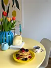 – Jeg er veldig glad i det lille spiseområdet mitt. Spisebordet som står der pleide å være hvitt, men jeg malte det pastellgult og det løfter hele rommet. Her har jeg masse lysestaker og en blomstervase jeg fyller med sesongens blomster hver uke.