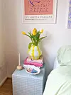 – Mine to små stuebord fra IKEA. Jeg får ofte spørsmål om hvor de er kjøpt. De pleide å være brune, men jeg malte ett lilla og ett rosa.