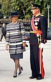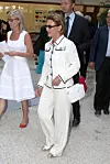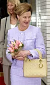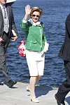 Kong Harald og Dronning Sonja på vei til middag under statsbesøket i Vietnam i 2004, fotografert utenfor Melia Hotel i Hanoi. Dronningen iført en hvit dress, som både er flott og gjennomført. Perfekt til anledningen og i tråd med hennes tidløse stil.