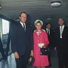 Kronprins Harald og Prinsesse Sonja ankommer Heathrow Airport i London i 1969. Prinsesse Sonja iført et rosa sett, med grønne detaljer i halsen og rundt hodet, et uttrykk som tydelig speiler tidsånden og hennes tidlige, sikre sans for stil. Øyeblikket gir et sjeldent innblikk i starten på et langt liv i offentligheten, der mote allerede fungerte som en del av hennes identitet.