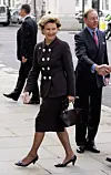 Dronning Sonja ankommer Royal Institute of British Architects i London 26. oktober 2005, som del av et tre dager langt statsbesøk til Storbritannia. Besøket markerte 100-årsjubileet for Norges selvstendighet fra Sverige og samlet representanter fra kultur, arkitektur og offentlig liv. Dronningen fremstår elegant og representativ i et sort sett, som understreker både anledningen og hennes rolle.