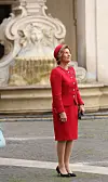 Dronning Sonja ankommer Palazzo Chigi i Roma 6. april 2016, i forbindelse med et offisielt statsbesøk til Italia. Med sitt sikre blikk for detaljer og en gjennomført stil tilpasset anledningen, fremstår dronningen både representativ og tidløs i et rødt sett. Besøket var en del av et bredt diplomatisk program og understreket de nære båndene mellom Norge og Italia, der mote og formell etikette gikk hånd i hånd med politikk og kultur.