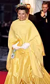 En nydelig Dronning Sonja under bryllupet til Prins Joachim og Prinsesse Alexandra av Danmark ved Frederiksborg slott, iført en gul kjole som ga antrekket et elegant og høytidelig uttrykk til anledningen.