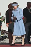 Dronning Sonja under den offisielle velkomstseremonien på Slottet i Oslo 10. oktober 2012, i forbindelse med det finske statsbesøket. Dronningen var iført en lys blå frakk med matchende hatt til den høytidelige anledningen.