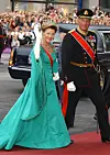 Kong Harald og Dronning Sonja under bryllupet til Kronprins Haakon og Mette-Marit i Oslo. Dronningen var iført en turkis kjole, komplettert med smykker og tiara som var nøye avstemt antrekket og den høytidelige anledningen.