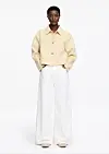 Lyse vide bukser i smørgul farge henger mot hvit bakgrunn.