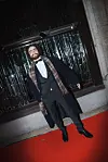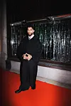 Arif i en stripet, dobbeltspent smoking og ulljakke med fuskepelskrage.