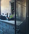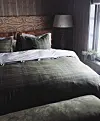 – Det er nok en litt røffere stil på hytta med mer treverk. Der vil jeg at det skal være mørkere og lunere, og at fargene skal være dypere. Vi har beiset tak og vegger mørke og vinduene er svarte – jeg er superfornøyd med det valget! Badene består også av mørke fliser og treverk på veggene. Jeg tror faktisk ikke jeg har et eneste hvitt møbel eller annet hvitt interiør der.