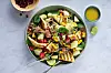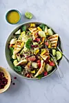 Topp med halloumi og ringle dressingen over. Pynt gjerne med noen friske urter.