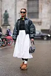 Å blande sommer- og vintergarderoben er sjelden enkelt, med mindre du mestrer lag-på-lag. Leggings, sokker, en tynn strikkegenser, en skinnbomber og selvfølgelig pålitelige Ugg-boots varmer opp et elsket ballongskjørt fra sommeren og skaper et antrekk som fungerer til flere anledninger.