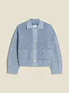 En grovstrikket kardigan, hvite shorts og topp til – en trio som hører hytteliv til!