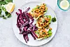 6. Fyll hjertesalat-bladene med avokadomosen, kokkosgulerøttene og den krydrede kikertblandingen. Skvis over den andre halvdelen av sitronen og server med lilla søtpotet-fries til.