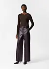 En burgnderfarget skinnbukse i kombinasjon med en burgunder genser, et ekstra stort skjerf og en lys kåpe – denne looken ønsker vi å se mer av!